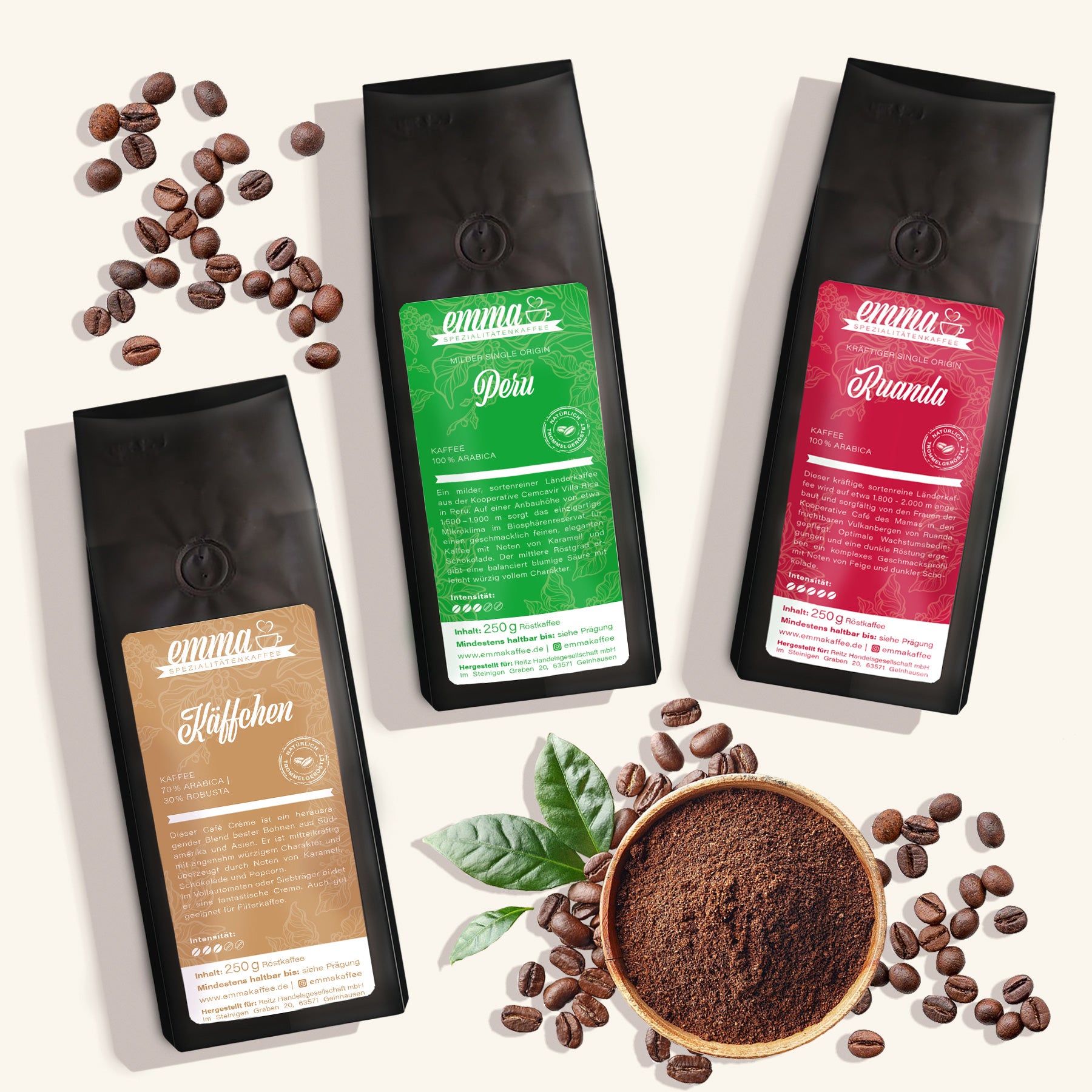 Emma Spezialitätenkaffee steht für handwerklich geröstete Bohnen und exzellente Qualität. Unsere Bohnen werden ausschließlich von Hand und mit viel Erfahrung und Liebe geröstet. Unser kleines, aber feines Sortiment zeichnet sich durch ausgewählte Produkte aus, die jeden Kaffeeliebhaber glücklich machen. Egal ob für den passenden Filterkaffee, Espresso oder Kaffee Creme. Bei uns bekommst du nicht einfach nur Kaffee, sondern deinen persönlichen Wohlfühlmoment und einen Schluck Glück in der Tasse.